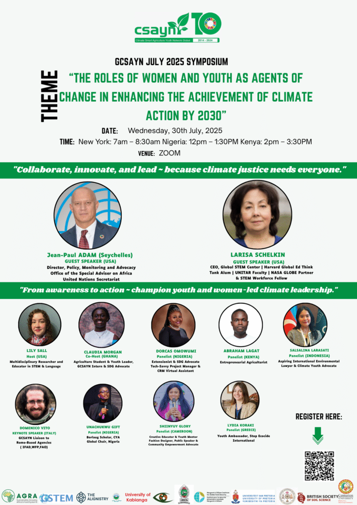 On behalf of Mr. Divine Ntiokam, Founder and Executive Director of the Climate Smart Agriculture Youth Network Global (GCSAYN), we are pleased to invite you to the upcoming GCSAYN July 2025 Symposium, a high-level virtual dialogue focused on the critical role of youth and women in advancing climate action and sustainability.